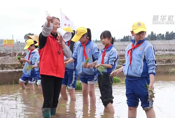 曲靖市麒麟区北关小学组织开展“乐趣农耕 欢乐六一”插秧实践活动。图片来源于新华网