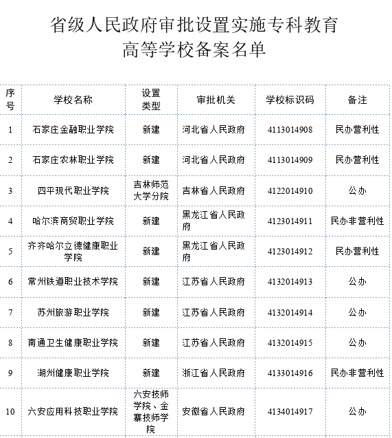 根据《中华人民共和国高等教育法》《普通高等学校设置暂行条例》等有关法律法规和政策文件的规定,现将省级人民政府审批设置的专科层次高等学校备案名单予以公布。