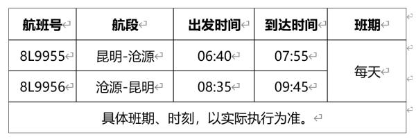 祥鹏航空昆明=沧源航班号为:8L9955/56,每天执飞,具体时刻如下: