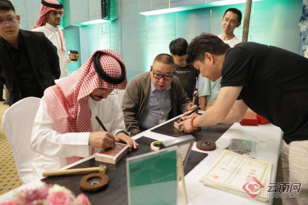 “我们这次带来50枚铜版画样本,沙特当地群众可以自己动手打造,定制属于自己蛇年福字画,打完还可以获得我们乌铜走银传习馆颁发的非遗传播人荣誉证书,满满的仪式感和参与感让大家感受到非遗的魅力,50枚铜版画样本很快就被抢光了。”云南乌铜走银传习馆负责人丁大为表示,今年年初,乌铜走银走出国门不是第一次,今年年初,乌铜走银亮相缅甸展会,同样深受当地群众喜爱。下一步,将继续推动乌铜走银走出云南、走出国门。