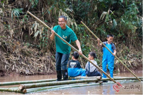 游客在基诺山雨林徒步路线沿途体验竹筏项目。彭奕凯 摄