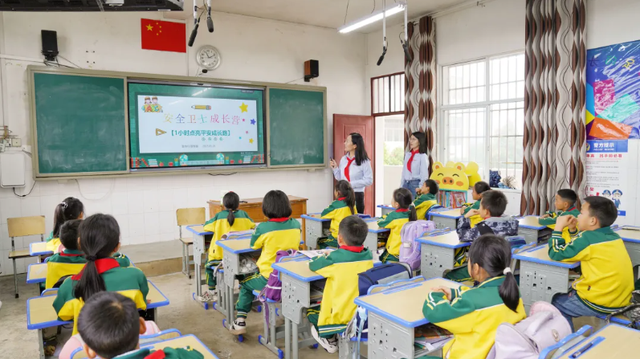 与此同时,在么所小学三年级教室里,28位小朋友坐在崭新的蓝色课桌前,一场沉浸式安全课正在上演。震坤行志愿者化身“安全老师”,用动画课件和互动游戏,带着孩子们学习校园安全知识。