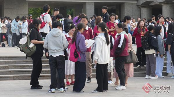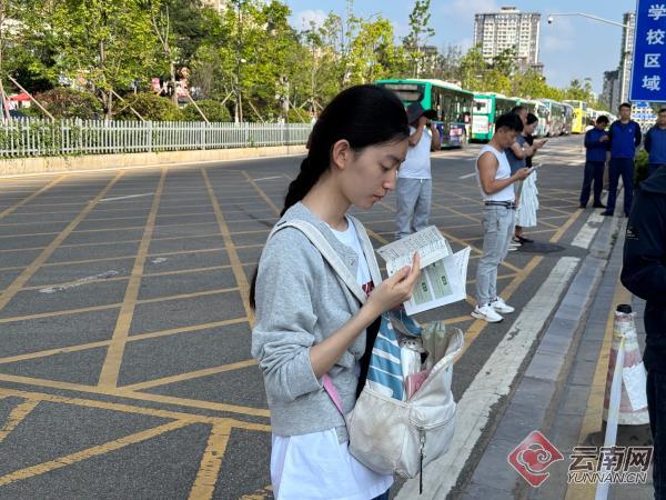 昆明市第一中学考点,考生抓住考前时间在广场复习。记者 许卓皓 摄
