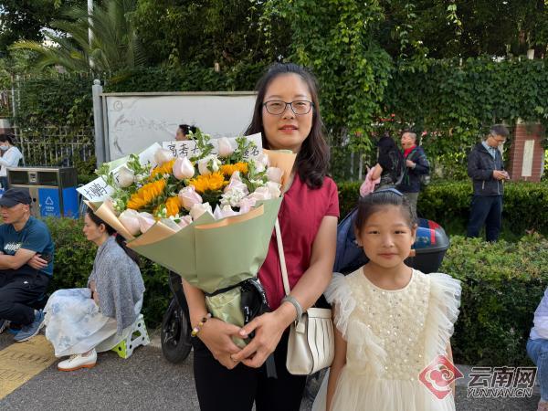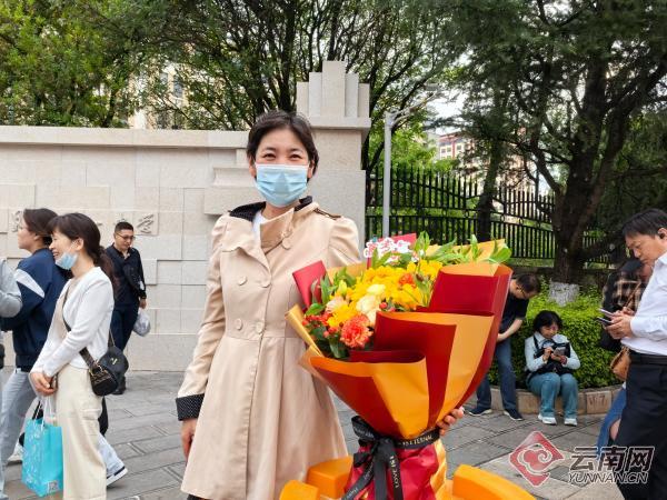 送考家长抱着鲜花在场外等待。记者 期俊军 实习生 熊靖明 摄