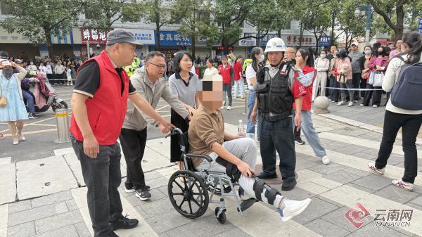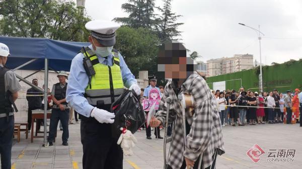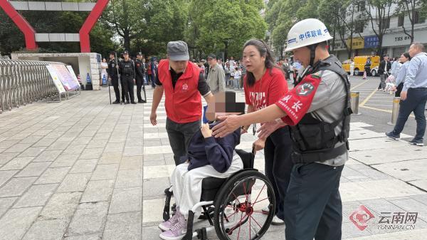 五华区黑林铺街道办万裕社区居委会志愿者们将行动不便的考生送入考场。记者 高祎祎 摄