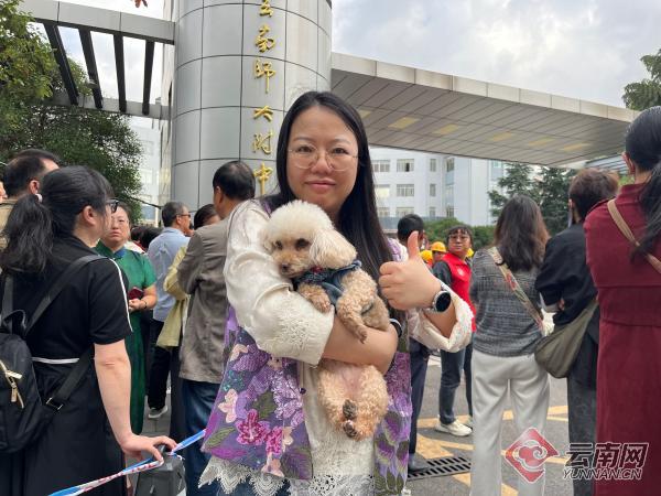 考点门口,萌宠为考生送考。记者 杨苑 摄