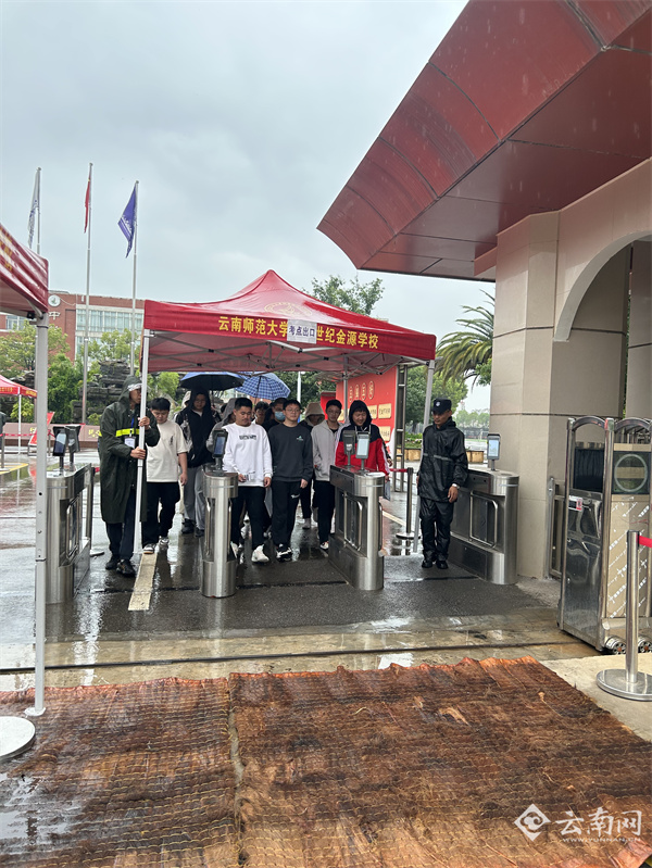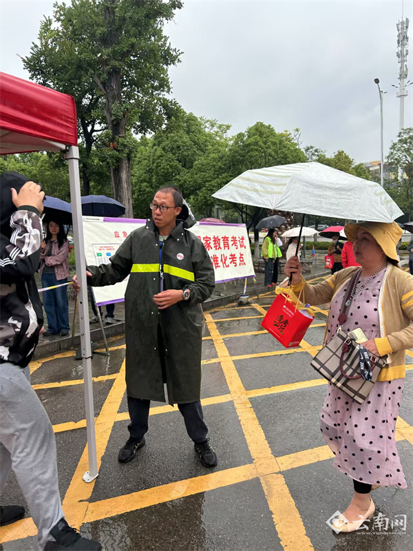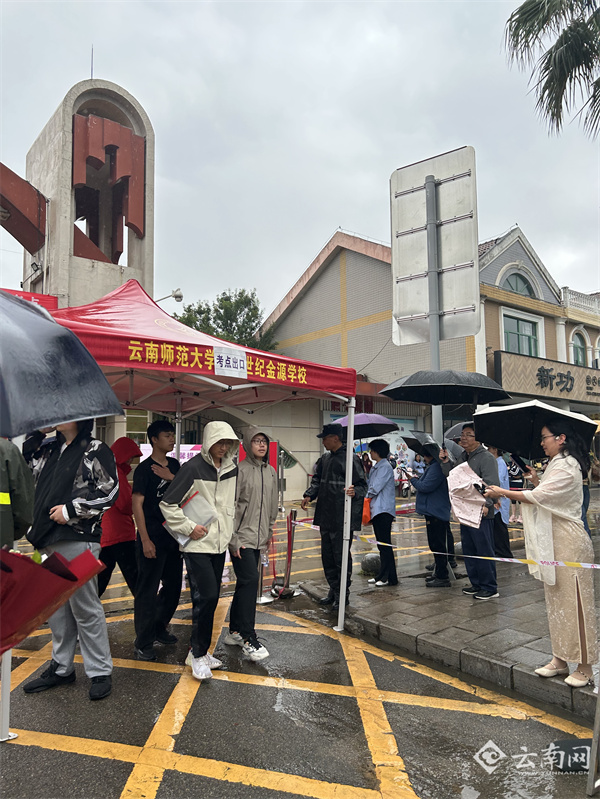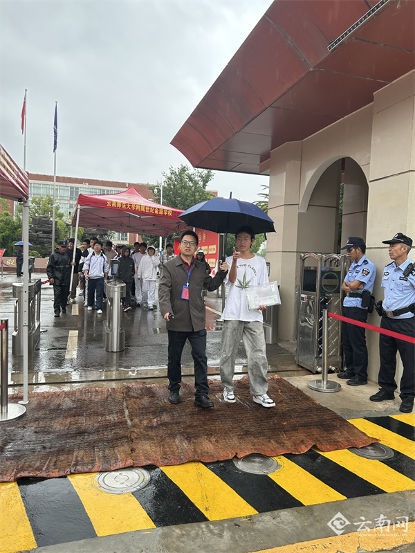 云南网讯(记者 牟燕红 通讯员 唐方雪)6月9日上午,暴雨突然降临。在云南师范大学附属世纪金源学校考点,老师们迅速行动,抬着雨棚冲向考场,这雨棚宛如移动的屋檐,为考生们撑起一片无雨的通道,将他们逐个安全护送至校门口。棚外暴雨倾盆,棚内滴雨不沾。当老师们把考生“摆渡”到门口后,等候在此的家长立刻撑伞“接管”,接力守护孩子。一棚一伞,考场内外的守护紧密衔接,这接力的场景,恰似一场充满爱意的传递仪式,展现出社会各界全力护考的温暖与坚定。