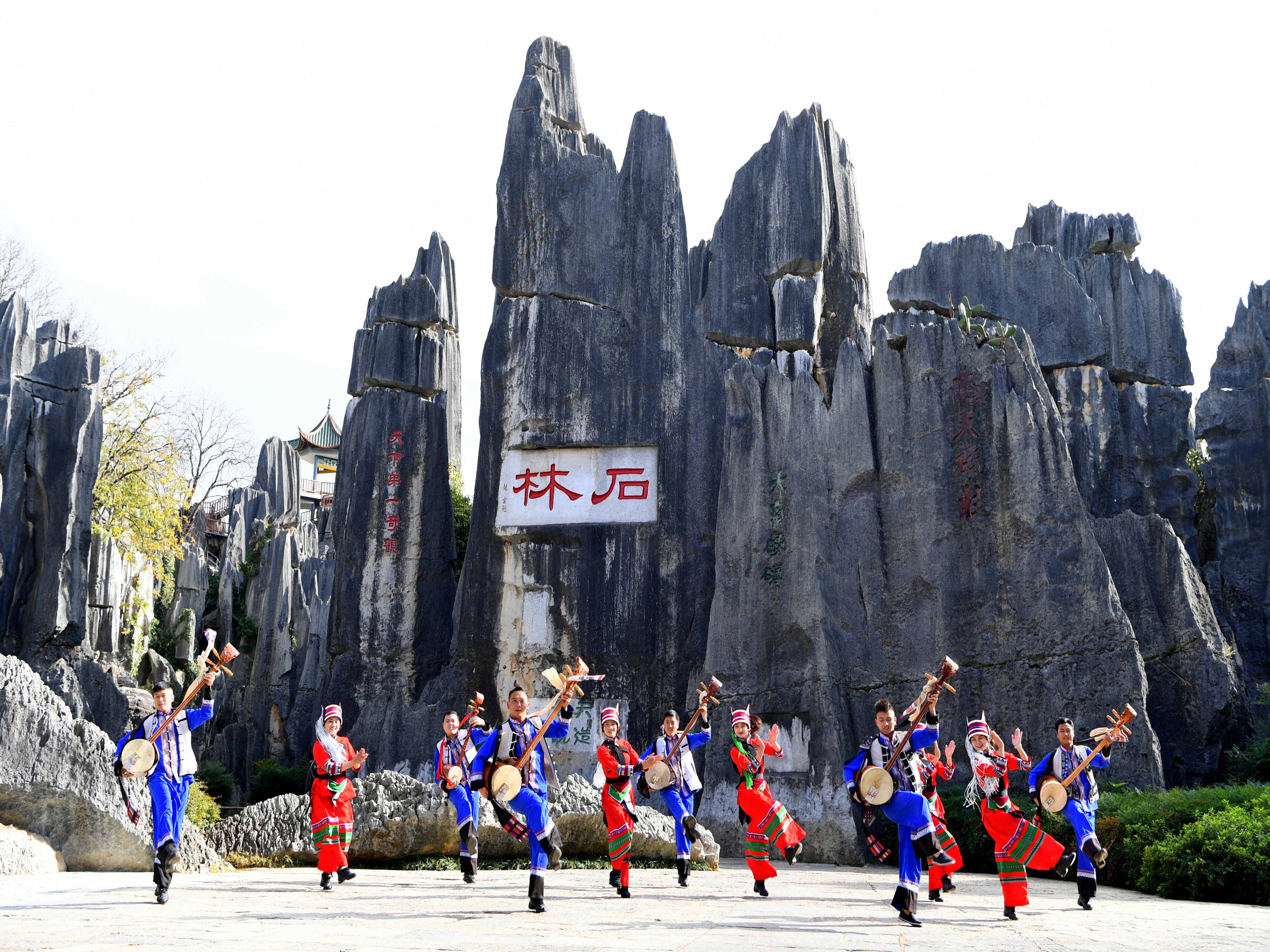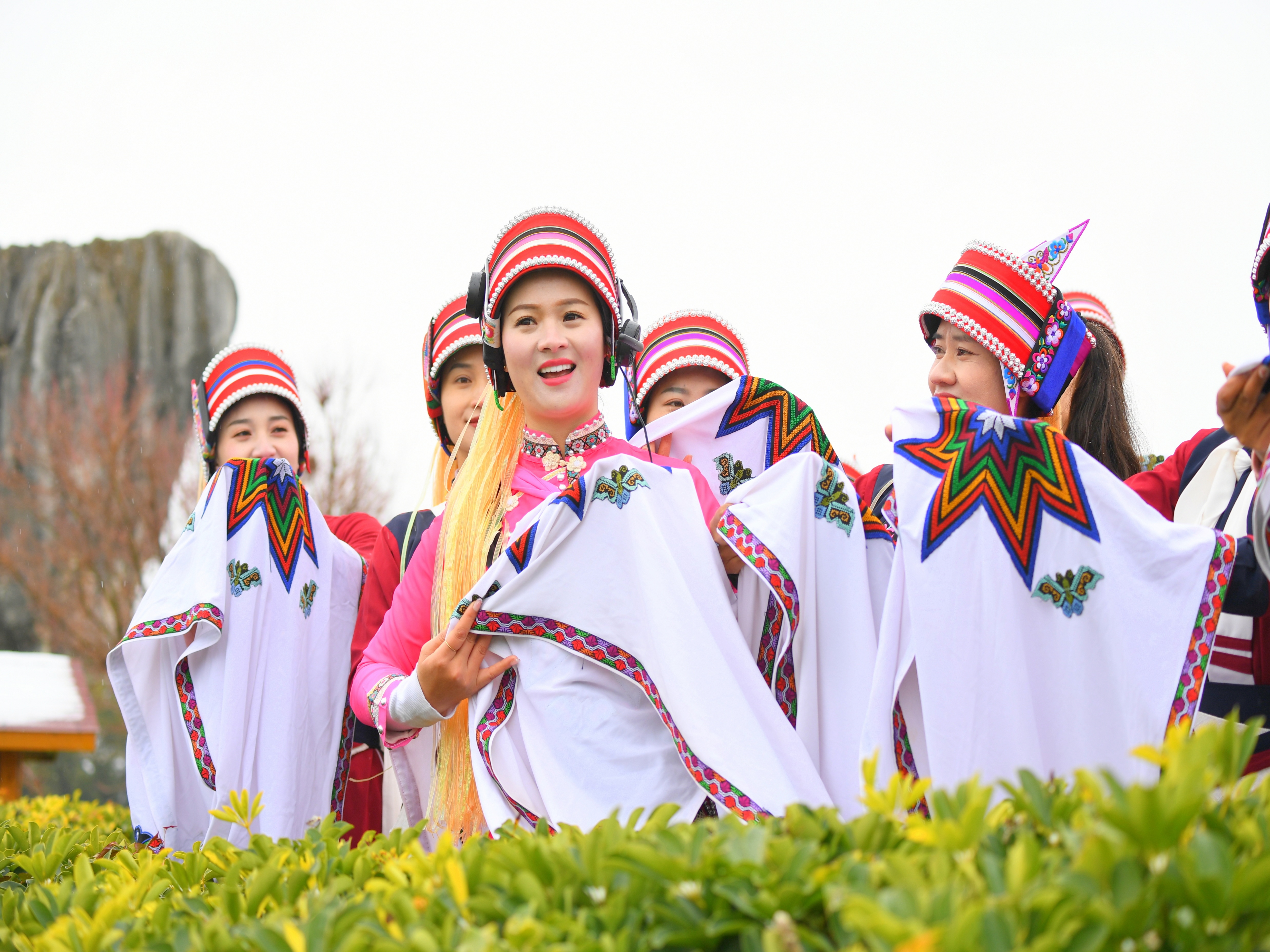 今年5月1日至4日,“千年烟火凝一瞬,醉人彝风绽芳华”阿诗玛生活片段展演在景区多处同步开展,民俗大联欢、电影对歌情景再现、沉浸式接亲表演,让游客仿佛穿越时空,成为阿诗玛传奇中的一员。“花针穿梭冬夏,三弦舞动山川”阿诗玛非遗互动展演,通过彝族三弦舞、刺绣等歌舞展示与游客亲密互动,使非遗的魅力变得可触可感。智慧互动为遗产焕新注入了强劲动力。AR技术的引入,让游客只需用手机扫描特定石峰,屏幕上便瞬间“复活”阿诗玛传说场景或地质演变动画;夜幕下的地质主题沉浸式光影秀,以山石为幕,演绎亿万年地质传奇;为年轻群体定制的“石林秘境探宝”实景解谜游戏,巧妙融合地质知识与彝族文化线索,让探索之旅充满趣味与挑战……这些创新形式,使古老的地质奇观焕发出生动的时代魅力。