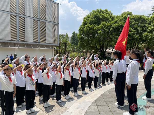 近日,云南省昆明市盘龙区茨坝中学附小一年级新队员入队仪式在具有光荣革命传统的西南联大旧址隆重举行,鲜艳的红领巾飘扬,红色基因深植童心。