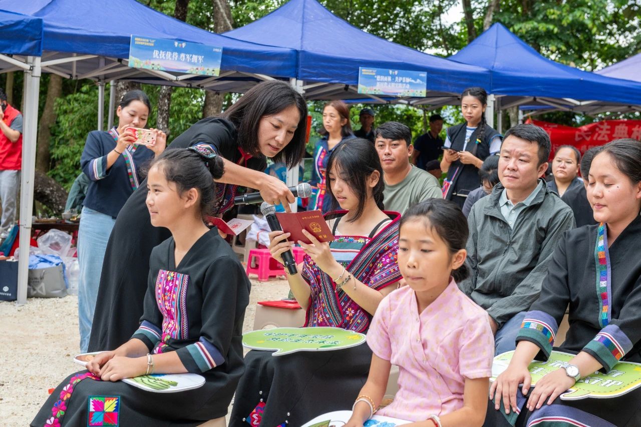 在普法宣传茶摊前,志愿者邀请茶农一起饮佳茗、聊法律、话茶事,并向茶农发放生态环保和移风易俗倡议书,为茶农提供古茶树养护技术指导。趣味游戏区,茶农和学生代表共同参与“蒙眼踏步”“画龙点睛”等游戏。活动最后,茶企、茶农、学生和护林员代表纷纷上台谈感想、话茶乡未来。