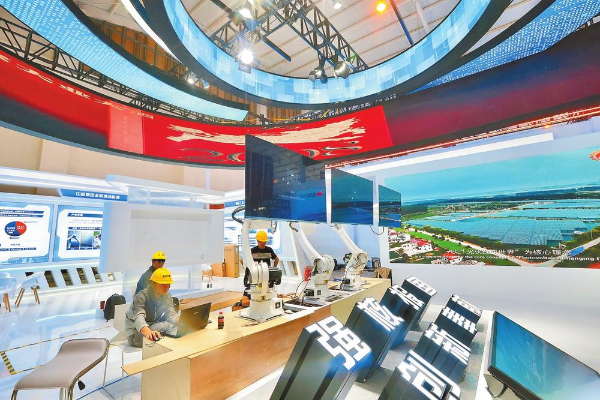 在中核集团展区,施工人员正紧张有序布展。 记者 高吴双 摄