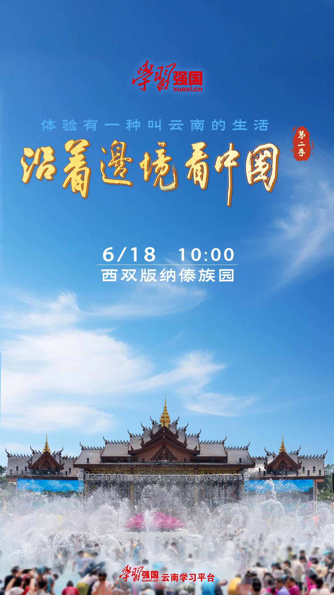 6月18日10:00,您可以通过“学习强国”App及社交媒体(视频号、抖音、B站),云南网、云南发布、“七彩云端”客户端、云视网、云新闻客户端、开屏新闻客户端,云南广播电视台官方微博、抖音、视频号,民族时报、云南法制报等官方抖音、视频号,以及云南广电新媒体协作机制全体成员平台观看本场直播,敬请关注。