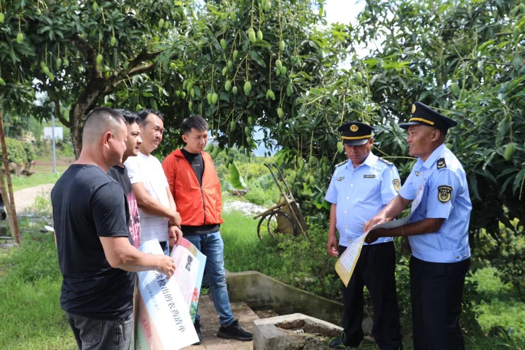在永康镇白塔社区芒果基地,永德县农业农村局农产品质量安全监督管理人员正在开展监测工作,他们仔细查看果园的农药使用记录,观察芒果、荔枝的生长状态,检查是否有病虫害以及违规用药留下的痕迹,选取不同位置、不同成熟度的果实进行采样。监管人员还不忘与果农沟通交流,耐心地向果农讲解科学种植知识和农药安全使用规范,手把手指导果农如何辨别优质农药,如何根据病虫害情况精准用药。果农们围在工作人员身边,认真聆听,不时提出问题,现场互动频繁。