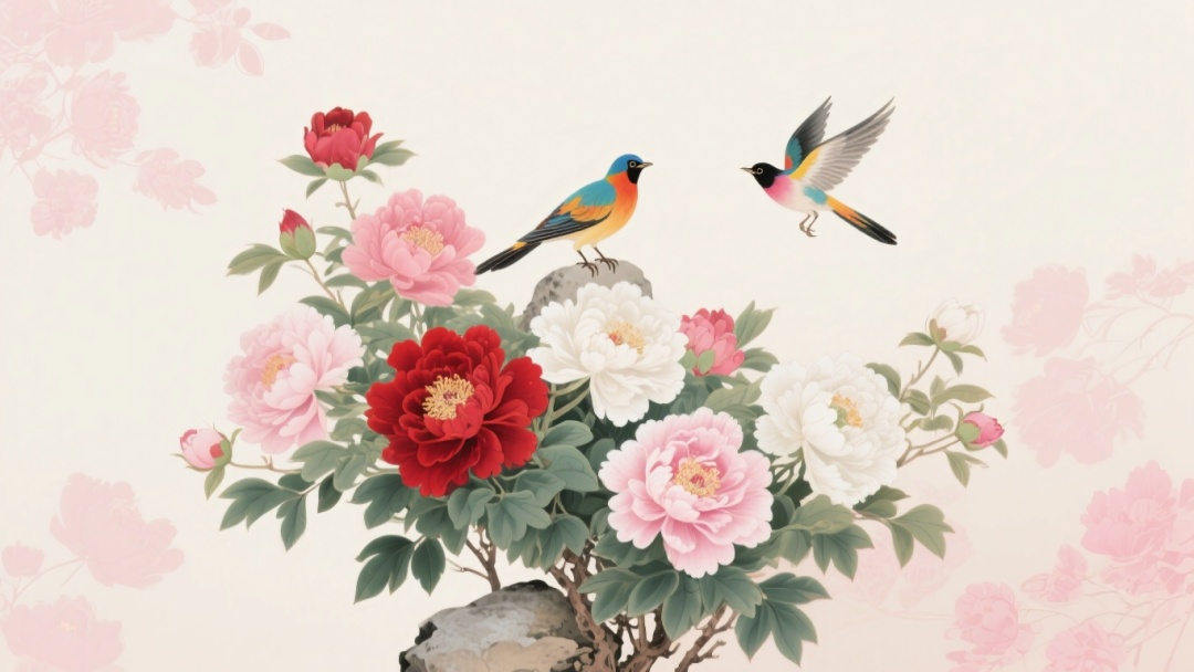 画纸徐徐展开,我看见她笔蘸白粉,笔尖蘸玫红,用皴行的方法画花瓣,涂花瓣,描芯包,逐步向外扩展。手法娴熟,晕染得当,我不禁有些许陶醉,仿佛看见她在给自己化妆,就像胭脂在脸上晕开一样,白中透着粉,粉中透着白。雌雄的辨认也大有来头,原来是用花蕊来分雌雄的。我大长见识,雌蕊中心形如石榴,雄蕊四周排列整齐,中藤黄加白粉勾线填色……我确确实实看见了两朵花,雌雄并蒂,娇艳地盛开在她的纤纤玉指下。从此,我的梦里梦外多了一幅画,一幅关于牡丹,关于爱情,关于我和她的画。