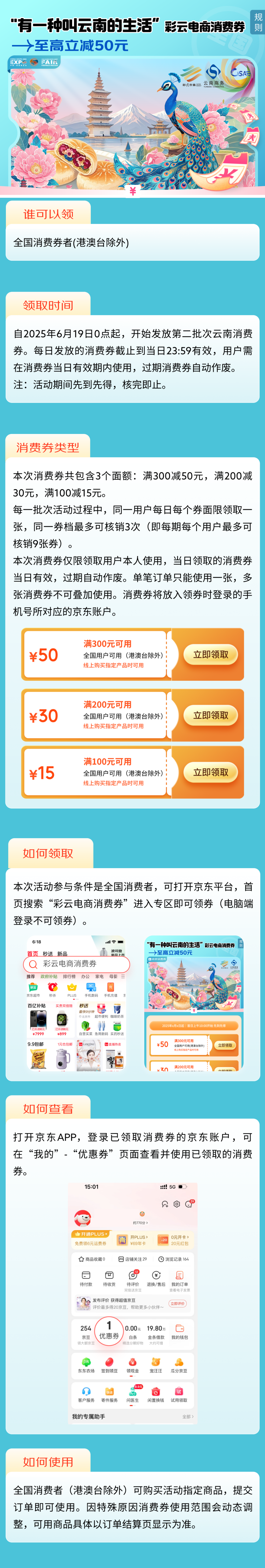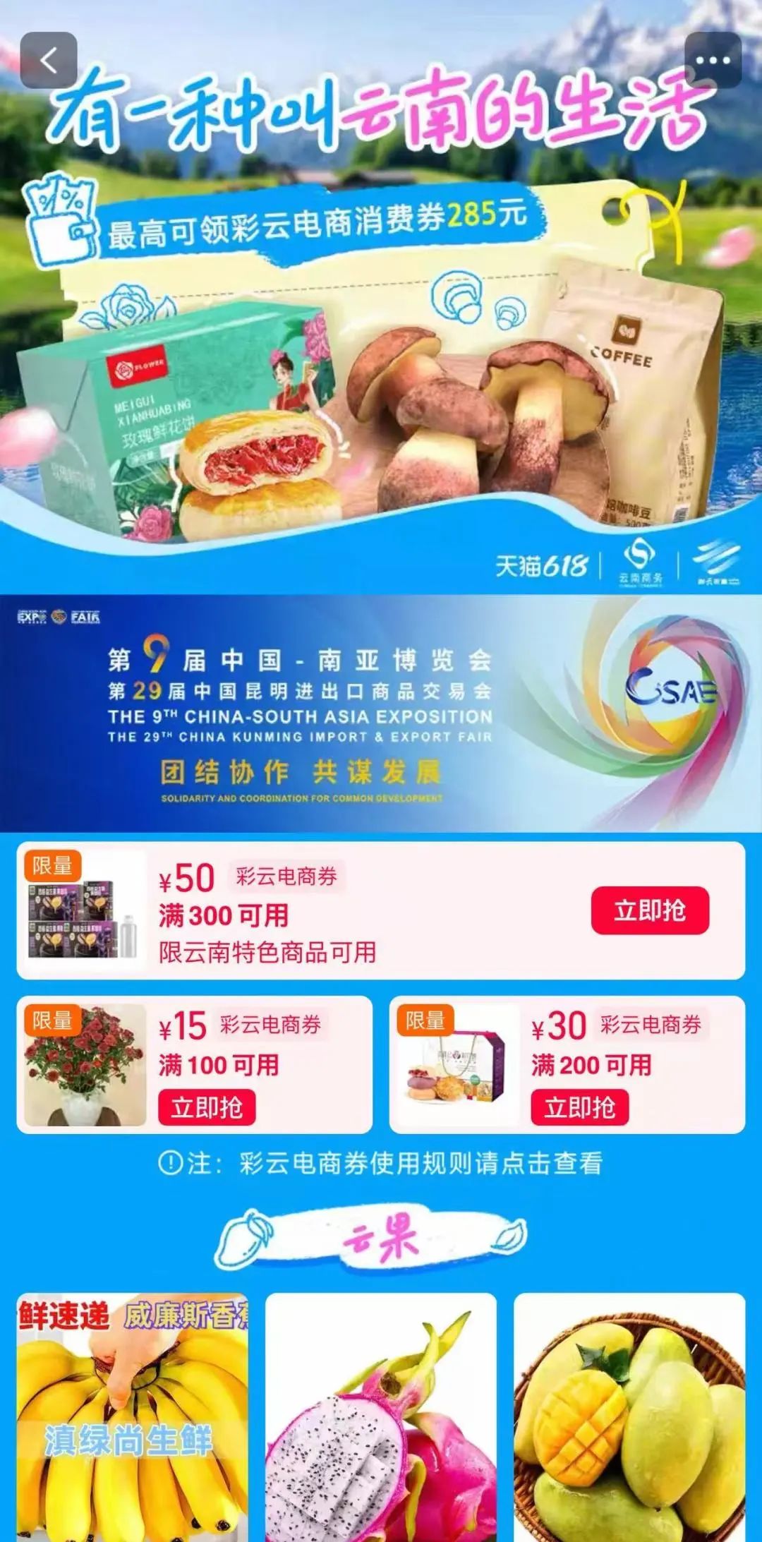 全国消费者均可登录淘宝、京东、抖音、快手、拼多多APP搜索“彩云电商消费券”进入活动页面领取,或在相关短视频、直播间链接中领券购买心仪云品,支付立减!