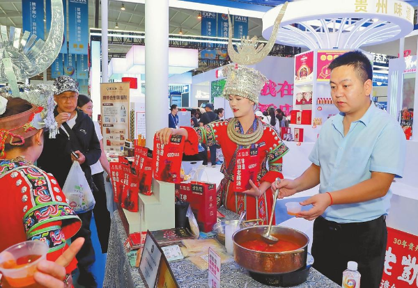 走进南博会4号展馆,贵州展区首先映入眼帘。贵州省14家企业携生态珍品、美酒佳肴而来,以“贵山贵水迎贵客·贵茶贵酒敬贵人”为主题,将贵州的特色元素与展位巧妙结合,把贵州名酒、贵州名茶、贵州名品、贵州味道融入展台,让客商、消费者感受贵州的独特韵味。“我们的展品带少了,开展首日不少产品都销售大半。腊肉、腊肠、脆哨等贵州特色食品受到各地客商和本地市民的欢迎。”贵州省展区负责人说。贵州赫章县农特产品开发有限公司负责人常玉告诉记者,带来的腊火腿仅开馆半小时就被抢购一空,这也为企业拓展市场鼓足了干劲。