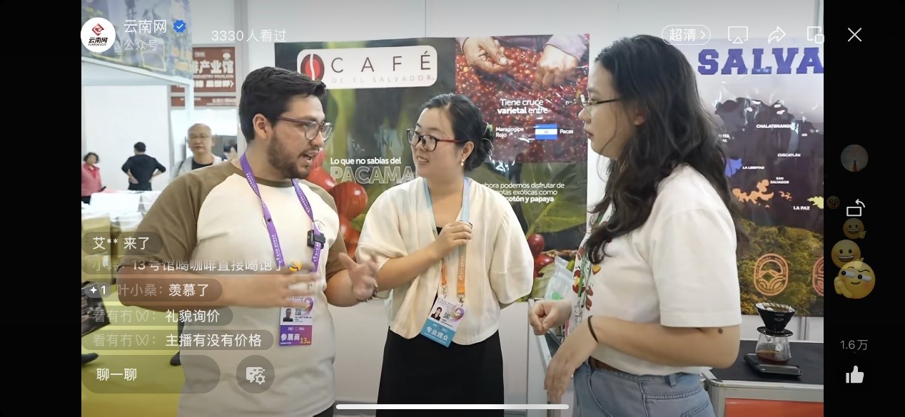 上午的最后一站,主播走进了咖啡产业馆,步入展馆,来自巴拿马的咖啡师现场展示手冲冷调咖啡的精湛技艺,并热情邀请大家品尝;萨尔瓦多的咖啡豆也得到了详细介绍。随后,众人移步至西双版纳展区,体验“左手咖啡右手茶”的惬意生活方式。