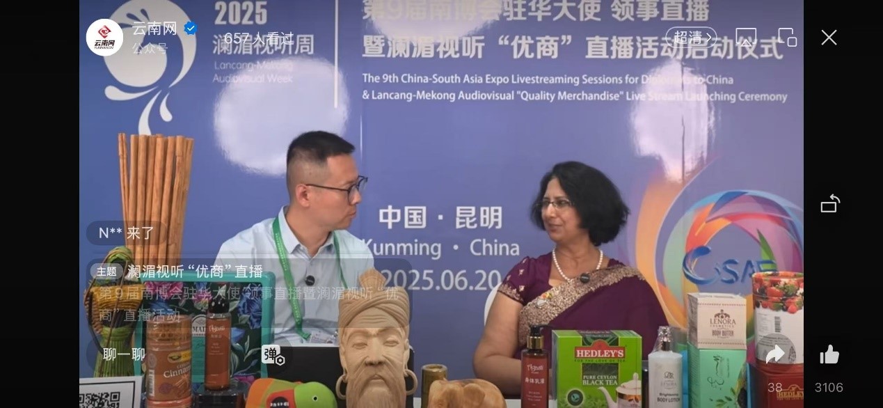 中途,我们还邀请到斯里兰卡的驻华大使走进直播间与主播对话,分享了她与南博会的故事。大使介绍了斯里兰卡的特产,也推荐了本国的旅游景点,分享了中国与斯里兰卡的建交故事。同时,也谈到未来斯里兰卡要加强同中国在电商、物流体系方面的学习交流,大使还表达了对云南、对昆明的喜爱。