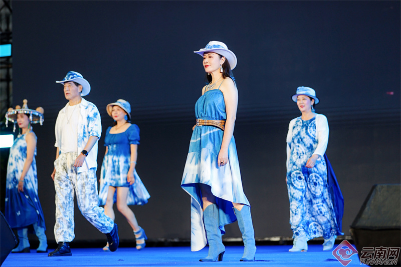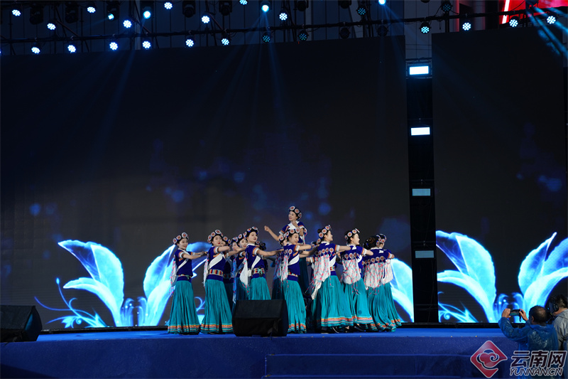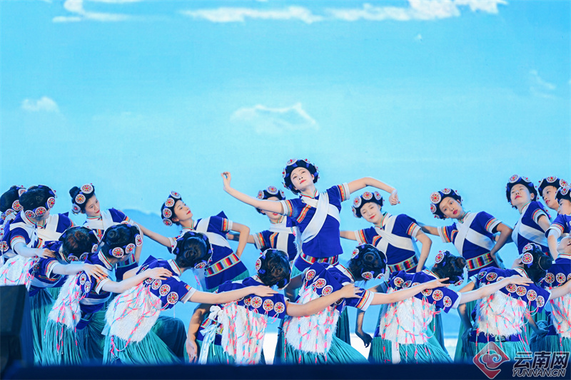 开幕式晚会以歌舞《滇池诗画》开篇,舞姿翩跹勾勒“半城山水半城湖”的春城意境。歌曲《相约春城》以动人旋律传递昆明热情,无缝衔接具有昆明官渡“阴丹蓝”头巾特色的舞蹈《蓝帕帕》,通过小女孩模仿母亲佩戴头帕、渔家划船劳作等场景,生动刻画了滇池畔勤劳妇女的形象,该舞蹈曾荣获云南省群众文化“彩云奖”。