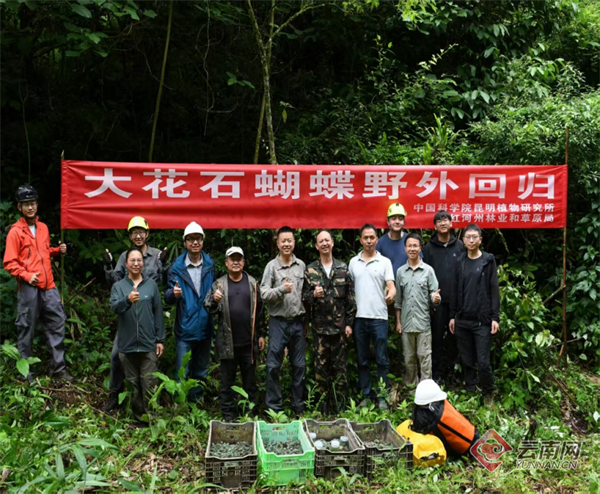 此次野外回归,科研人员在近乎垂直的石灰岩崖壁上精准定位种植,复原大花石蝴蝶天然的生长环境。回归工作及后续监测工作将由红河州林业和草原局与种质资源库共同开展。