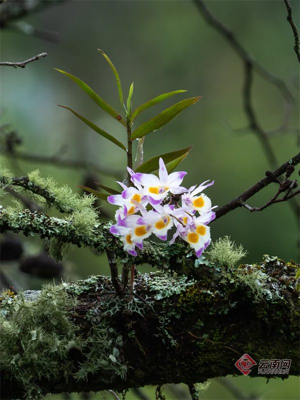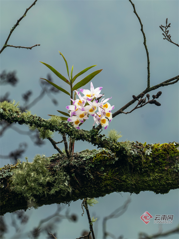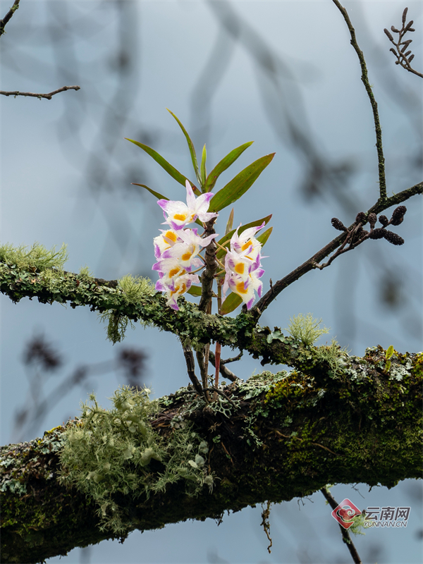 近日,临沧澜沧江省级自然保护区凤庆管护分局与社会公益人士开展资源调查工作,在海拔2300米自然保护区内一棵高大乔木上发现附生着一株野生石斛,正在绽放着美丽的花朵。