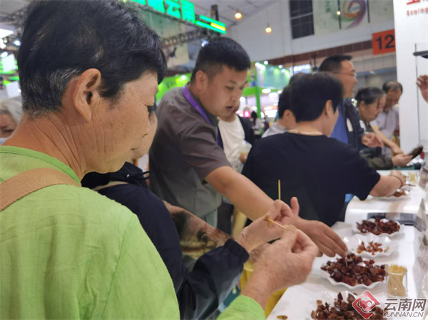 现代农业馆则以云南各州市的特色农产品为核心,展示了高原农业的独特魅力。从生态腊肉到休闲小吃,无不散发着浓郁的地方风味。来自陕西的游客吴先生在现代农业馆品尝腊排骨时赞不绝口。“我在丽江旅游时吃过,这次现场品尝更是坚定了对云南美食的认可。”吴先生此次不仅买了腊排骨,还买了云南鲜花甜肠。“这次来南博会真是大开眼界!买了正宗的云南腊排骨以及特色鲜花甜肠,是带给家人的绝佳伴手礼。”