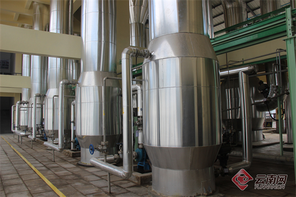 工厂内的制盐蒸发装置正在运作。