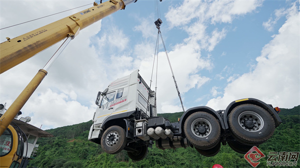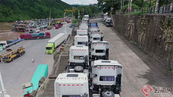 在关累港口岸海关查验区,50辆国产重卡牵引车整齐排列,巨大的起重机伸展着长长的臂膀,精准地将一辆辆重卡牵引车吊起,缓缓地放置到货船上。车辆查验完毕后,将从关累港起航,经澜沧江—湄公河出口至缅甸。