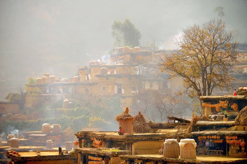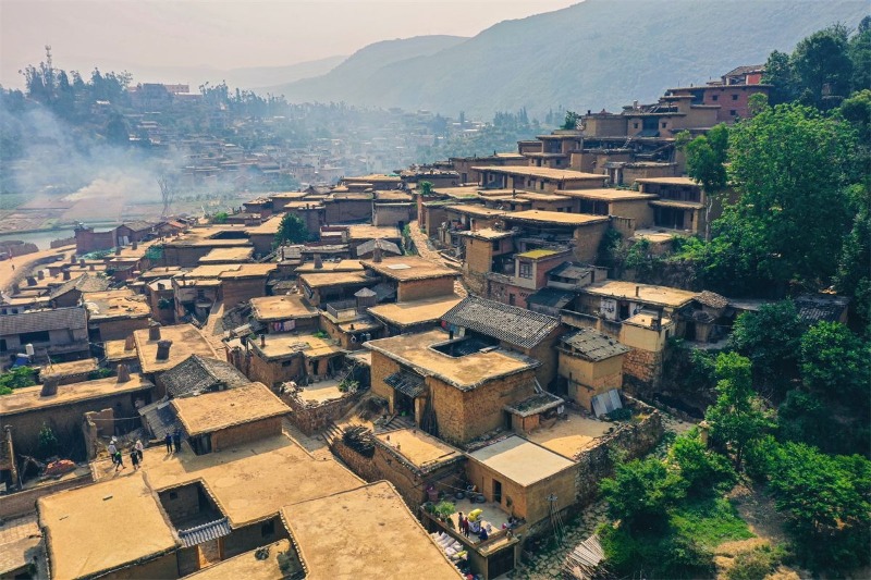 从溶洞的清凉世界重返地面,20多公里外的城子古村正沐浴在午后暖阳中。登上飞凤坡回望——600余栋土掌房沿着山势层叠铺展,褐黄土墙与黑瓦连绵成一片凝固的时光。穿过蜿蜒的巷道,与出门劳作的村民擦肩而过,哒哒的马蹄声远去,只余下鸡鸣犬吠不时萦绕耳畔。古老的彝族土掌房民居,深厚的历史文化底蕴和浓郁的原生态气息,让来者沉醉在村子的安静和质朴中。