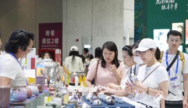 在第二十一届中国(深圳)国际文化产业博览交易会上,云南展区热闹非凡。作为第三次参展的“老朋友”,鹤庆银器展台精美、布置别具一格,陈列着非遗手工艺品如银茶壶、银手镯等珍品,吸引人们驻足观望,忍不住探寻鹤庆“银器锻制技艺”的深厚历史底蕴。