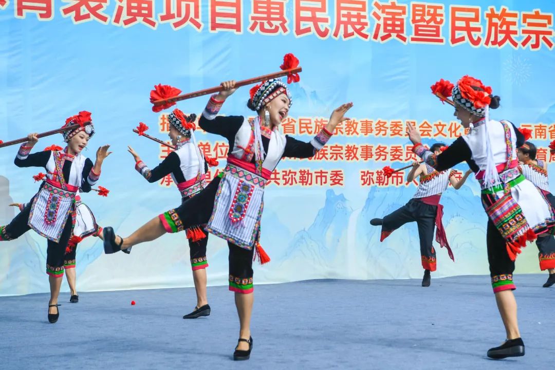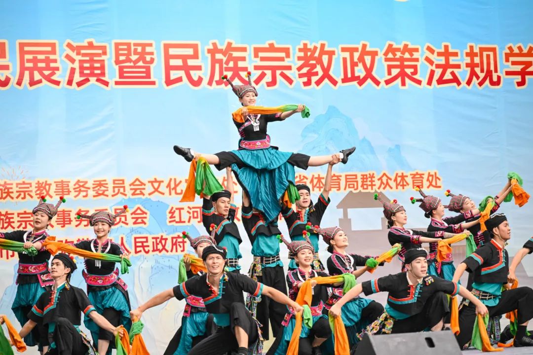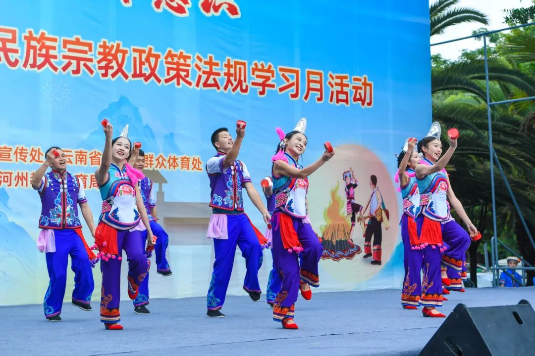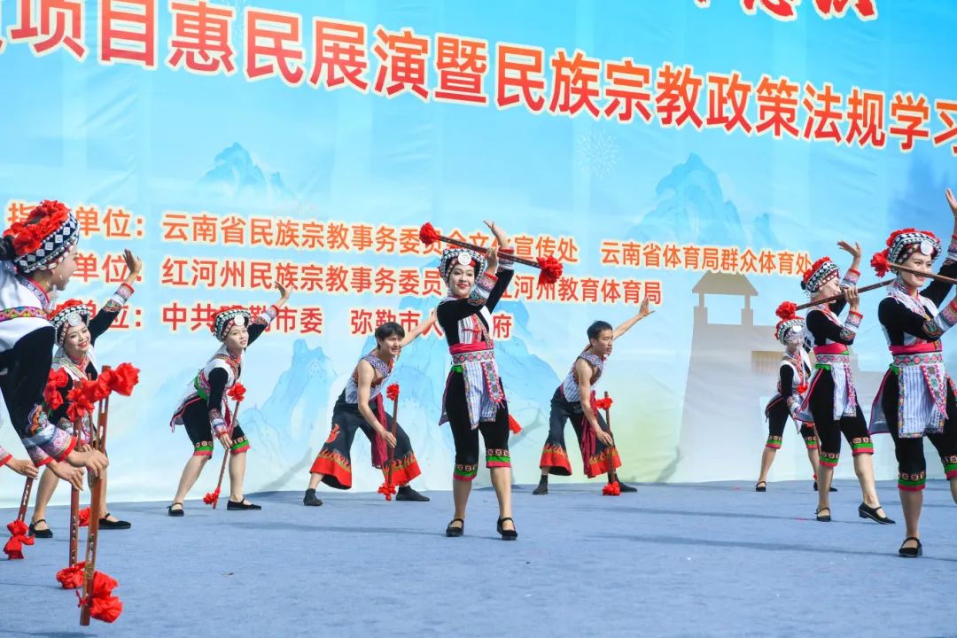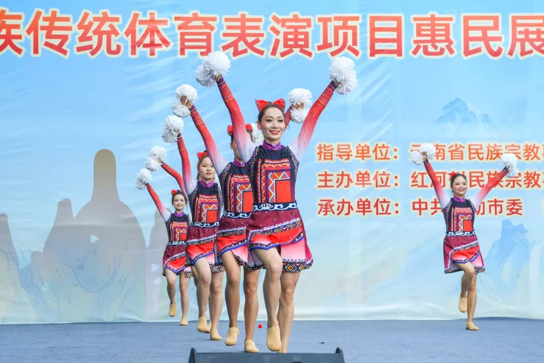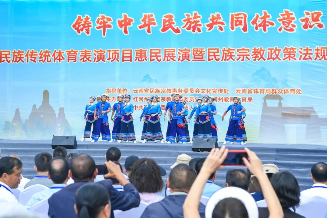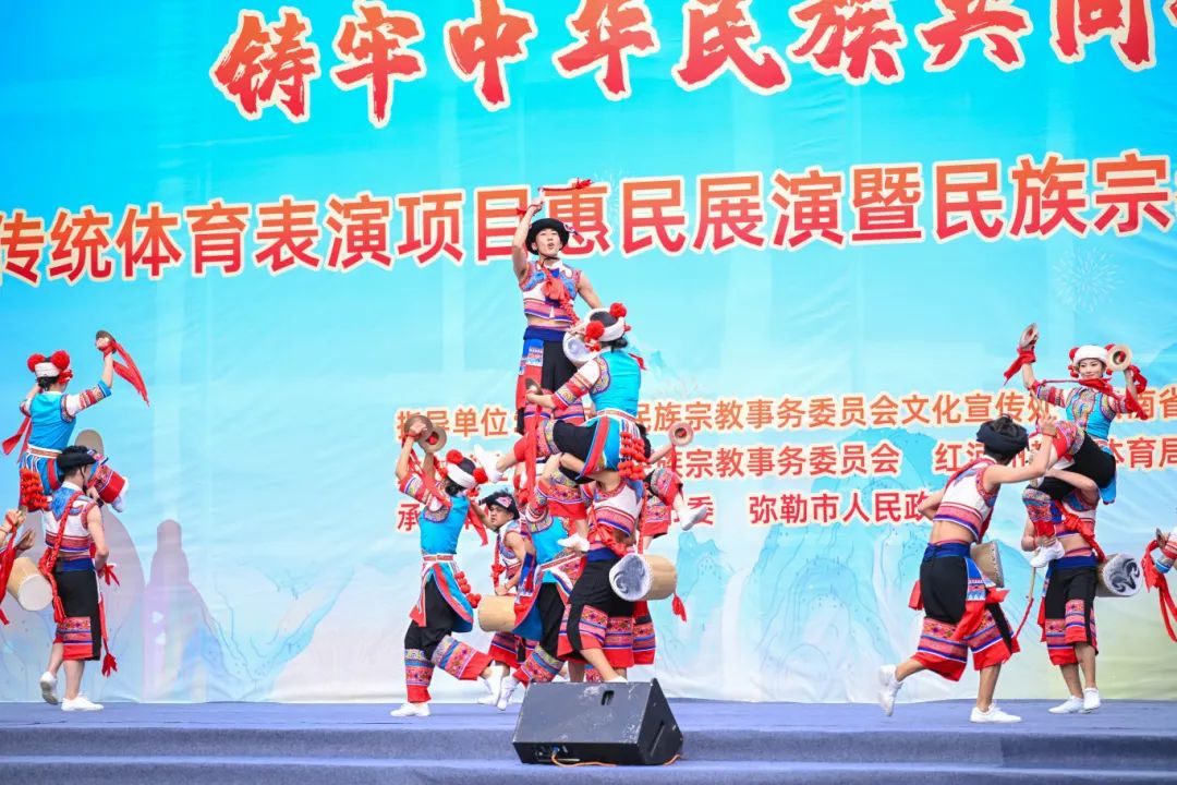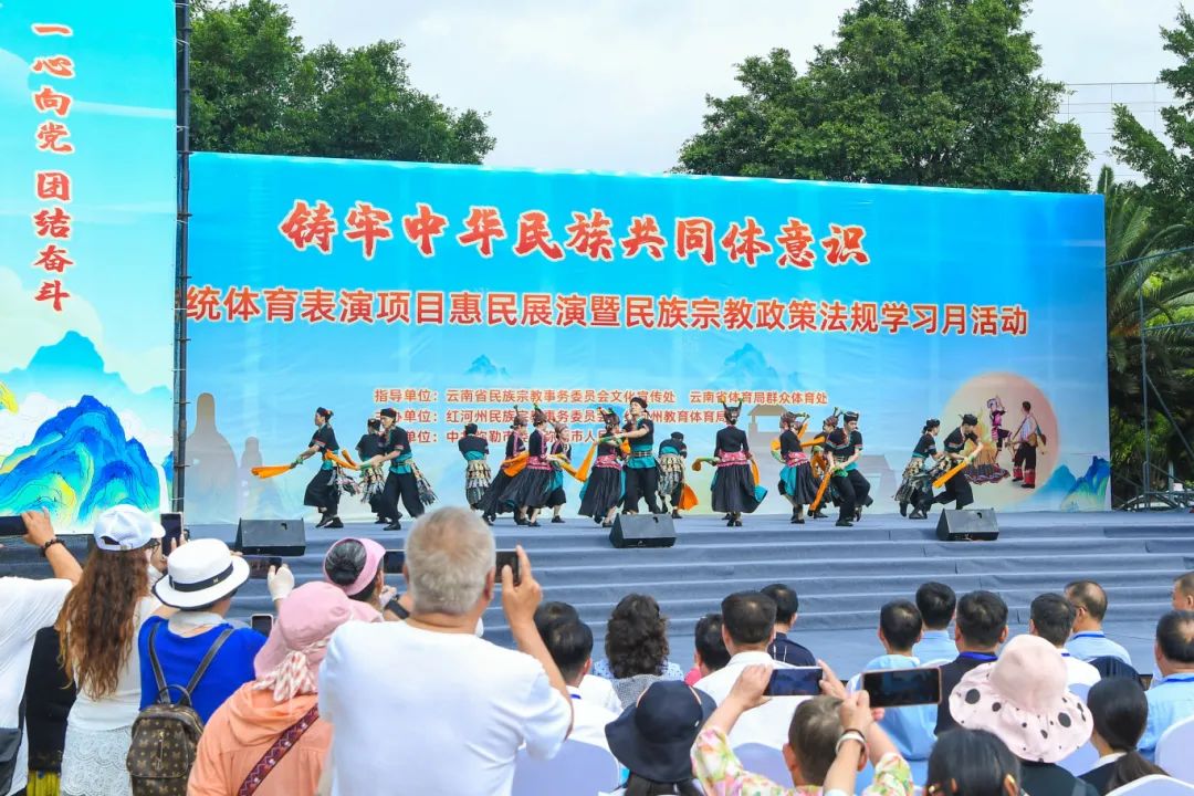 上午9:00,云南省民族传统体育表演项目惠民展演在湖泉广场大舞台精彩上演,来自文山州及红河州各县市的8个节目,共同谱写了一曲绚烂的民族团结华章。
