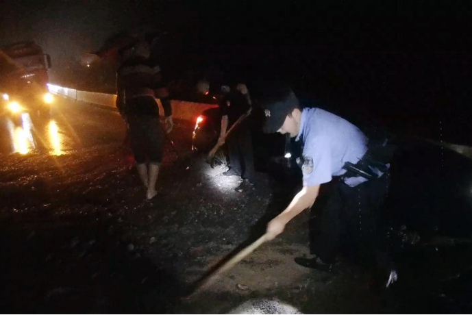 险情发生后,永善县公安局务基派出所迅速组织民辅警连夜赶赴事发路段,冒雨开展车辆指挥疏导、人员转移救助等抢险救援工作。