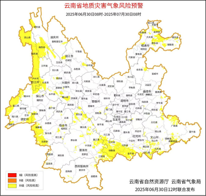 据省防灾减灾救灾委员会办公室对全省自然灾害风险形势会商研判:7月份我省全面进入防汛关键期,强降雨集中,单点性暴雨、大暴雨等强降雨天气过程频发,局部地区洪涝灾害风险高。其中,滇南、滇西南、滇西、滇西北为洪涝灾害重点防范区域,以中小河流、山洪防范为主,滇中局部、滇西南等地重点防范城乡积涝。同时,需重点关注昭通市、文山州、红河州、普洱市、临沧市、德宏州、怒江州、迪庆州等地质灾害高易发区域,防范受区域性、单点性突发强降雨过程可能引发的地质灾害,尤其是陡坡下、沟口、谷地内的村镇居民区和建设项目“两区三厂”危险性大。