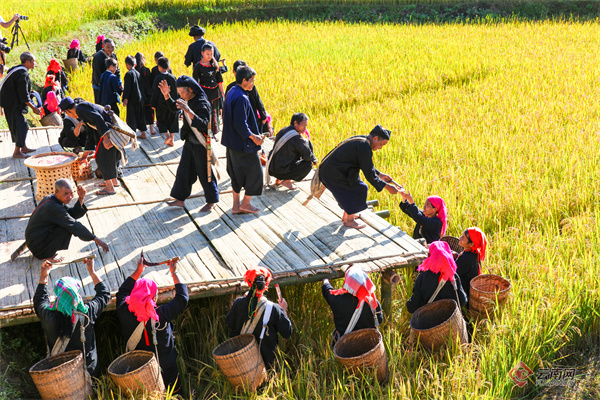 翁丁村村民为游客表演“取新米”。沧源县融媒体中心供图