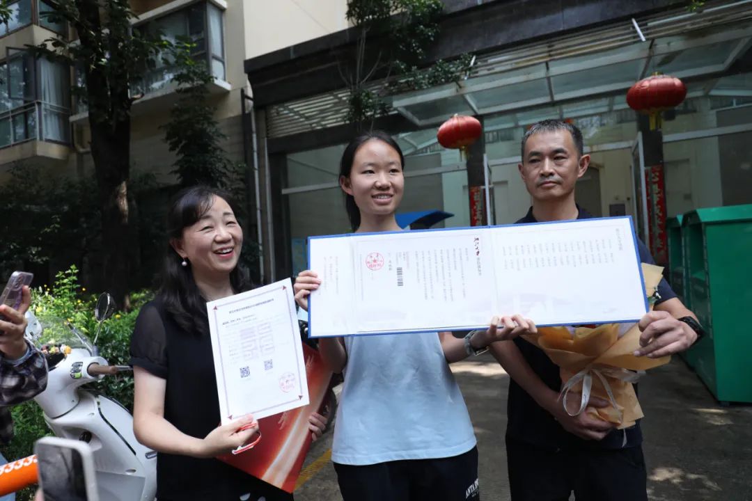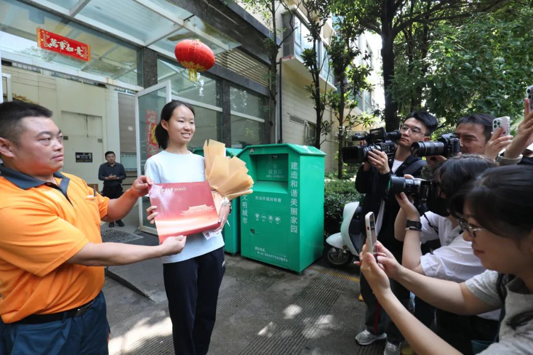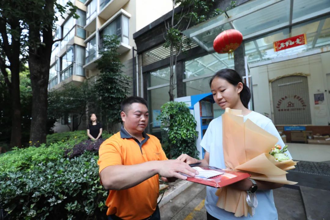 图为上午10点15分,昆明市官渡区黎明路,邮政工作人员将浙江大学录取通知书送到考生赵欣悦手中。