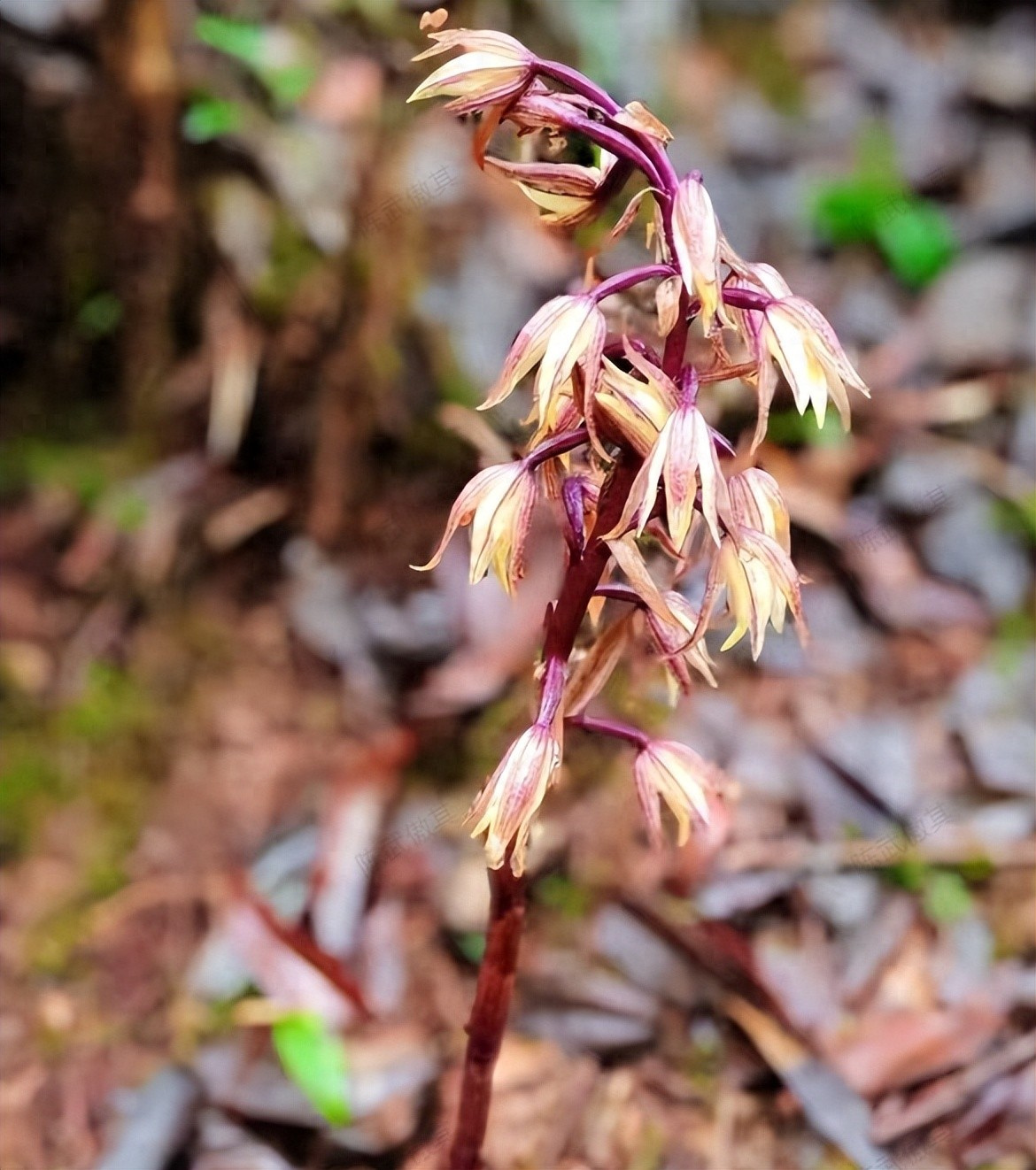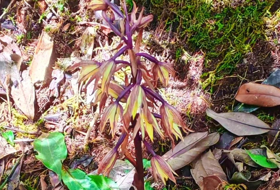 此次发现的大花无叶兰高约40厘米,植株上没有一片叶子,盛开的花呈紫黄色,蓓蕾呈紫色,花朵向下呈兜状,生长在海拔2450米的中山湿性常绿阔叶林内的半坡上。