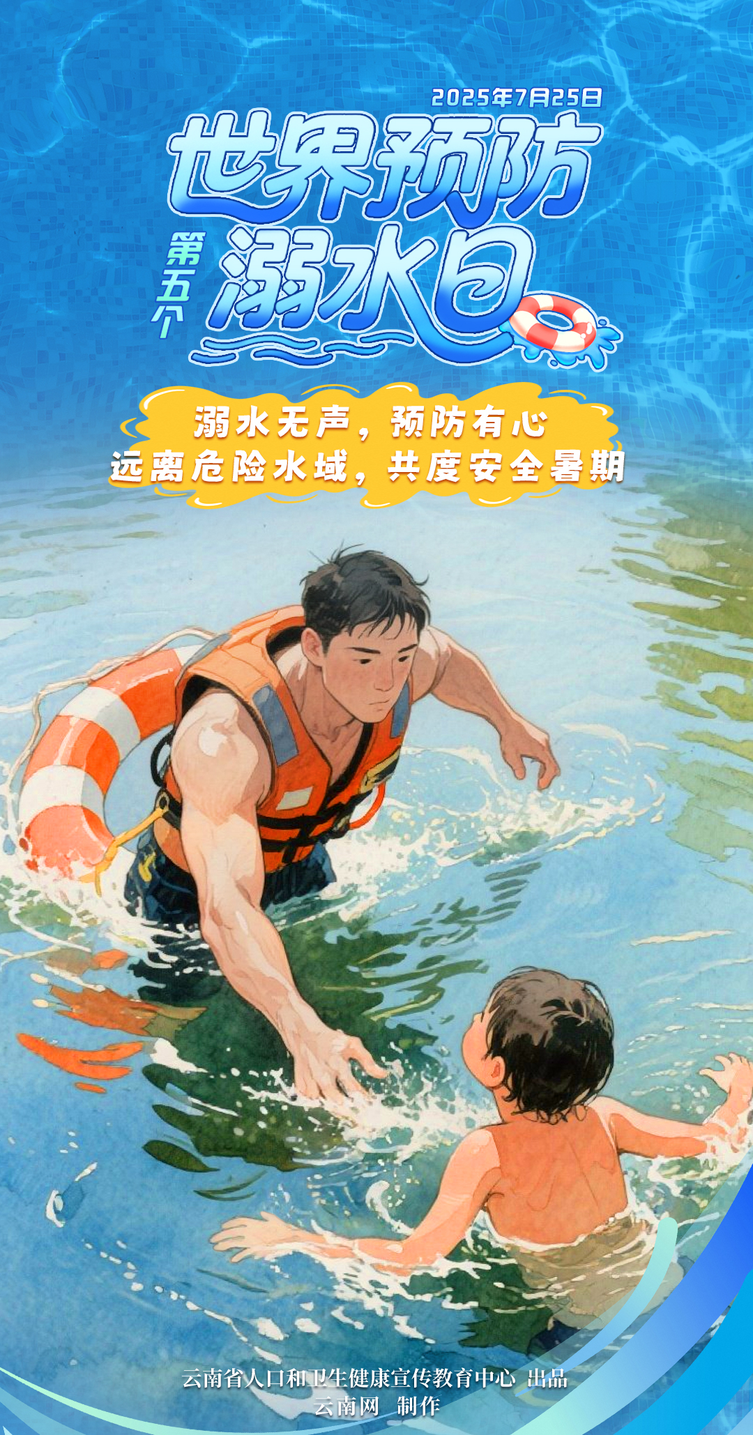 2025年7月25日是第五个世界预防溺水日。据悉,世界预防溺水日是由第七十五届联合国大会于2021年4月28日通过首个全球预防溺水决议而设立的全球性健康宣传活动日,旨在增强公众预防溺水安全意识,减少溺水事故发生。溺水是全球范围内导致意外死亡的主要原因之一,世界预防溺水日通过倡导水域安全知识普及、加强公共政策支持、推广游泳及急救技能培训等方式,呼吁各国政府、社会组织和个人共同行动,减少这一悲剧的发生。