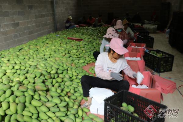 走进交易市场,一筐筐色泽艳丽的芒果整齐排列,工作人员熟练地进行分拣、打包、装箱,流水线作业高效流畅。收购商李浩介绍:“随着路同芒果大量上市,我们每天都在收购台农、金凤凰等品种,主要发往河南等大型市场。”各地客商纷至沓来,将路同芒果销往全国。