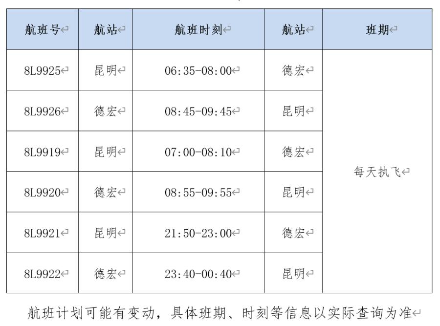 此次对该航线加密后,祥鹏航空昆明往返德宏的航班量达到每天3个,具体航班信息如下: