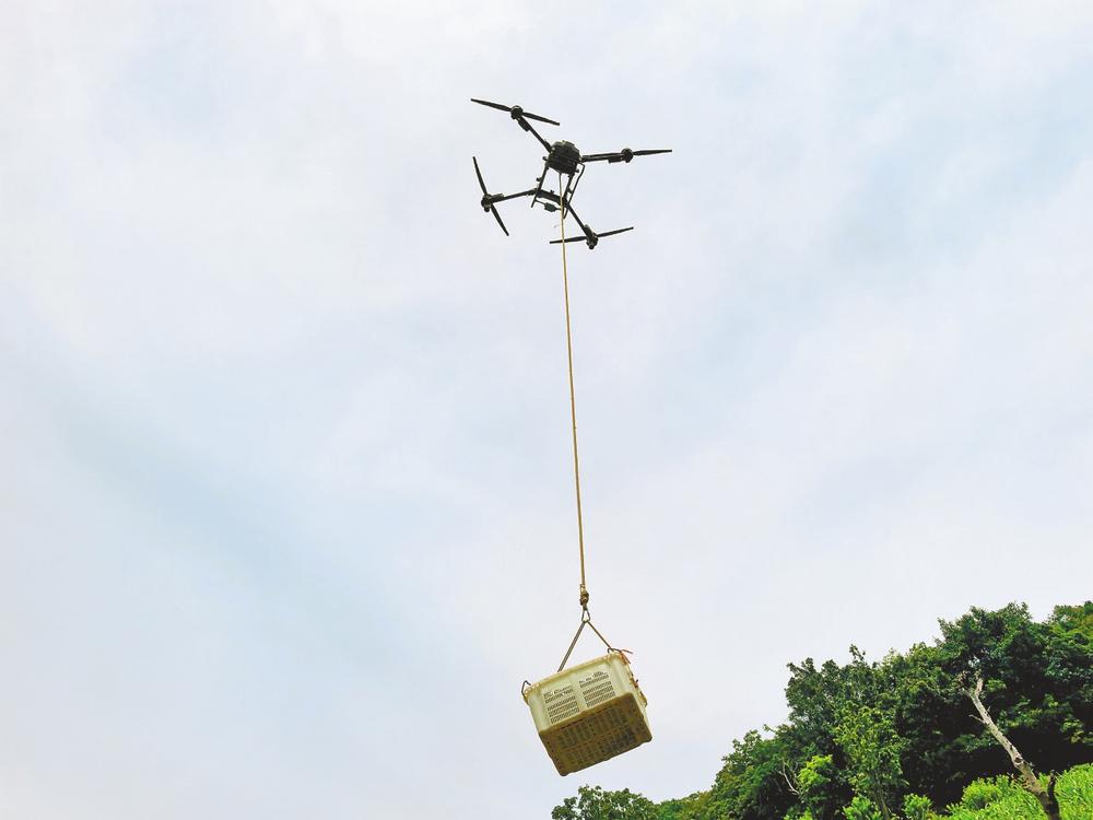 无人机吊运芒果。
