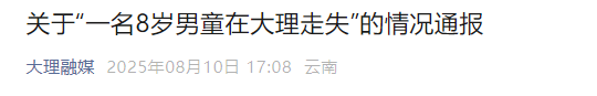 原标题:“8岁男童在大理走失”,官方发布情况通报