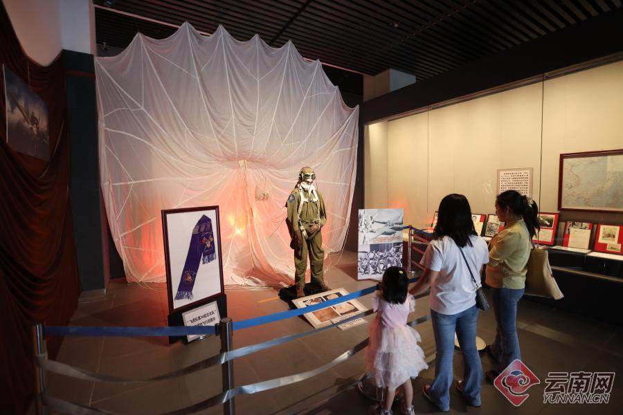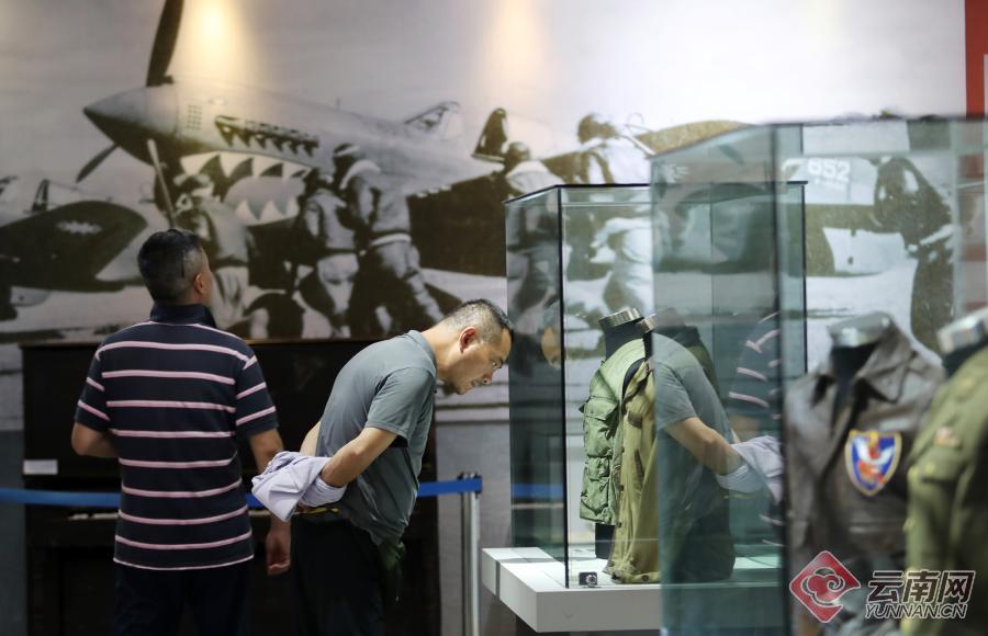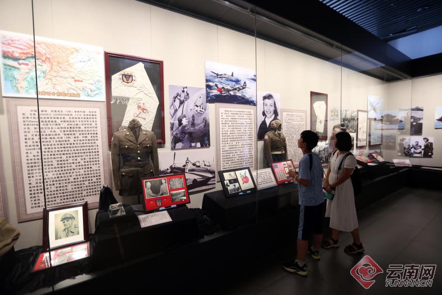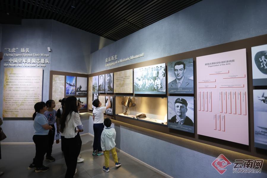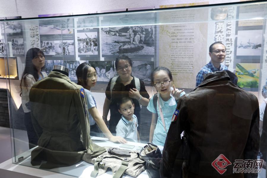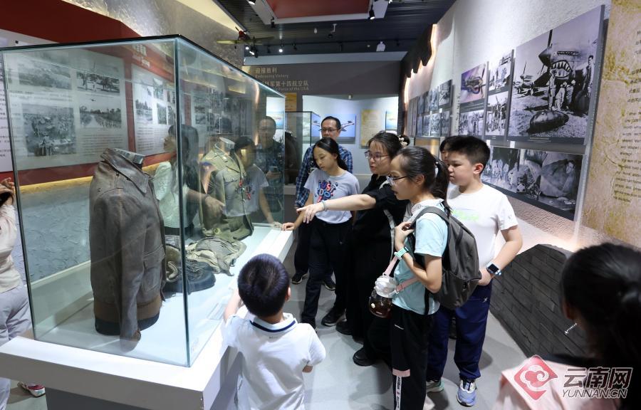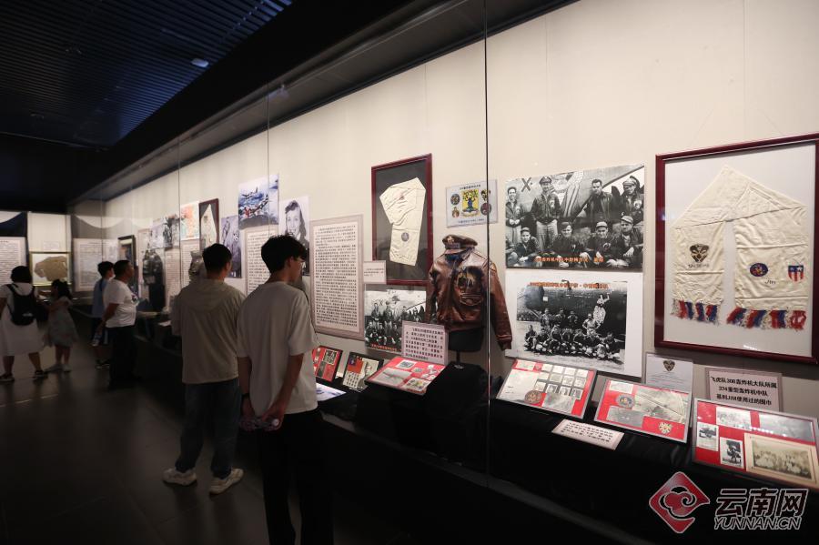 8月15日,市民游人在昆明市博物馆“长空飞虎——飞虎队文物展”常设展厅参观。不少家长带着孩子前来了解美国飞虎队援华血战长空的抗战历史。