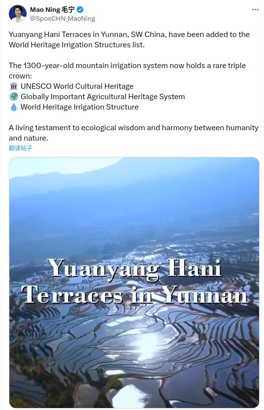 今天,外交部发言人毛宁再次向全球推介云南的元阳哈尼梯田,她在推文中写道:“中国西南部云南的元阳哈尼梯田入选世界灌溉工程遗产名录,拥有1300年历史的山地灌溉系统现在荣膺罕见的‘三冠王’殊荣:联合国教科文组织世界文化遗产、全球重要农业文化遗产、世界灌溉工程遗产。它是生态智慧和人与自然和谐共生的鲜活体现。”