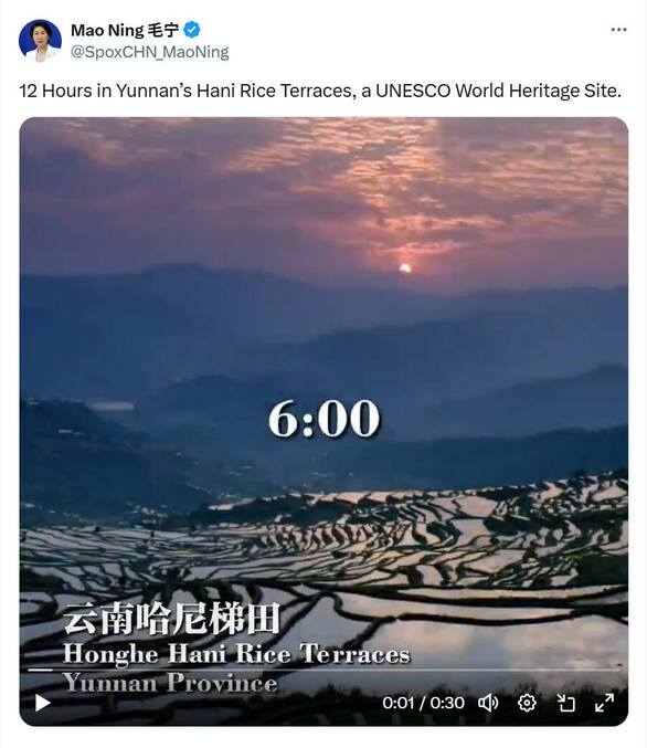 早在今年3月,毛宁就在海外社交媒体平台上发布过一段30秒的视频,展示的是云南元阳哈尼梯田的12小时,点赞这处人间胜景。