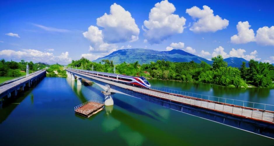 奔驰在老挝万象省境内欣楠里河特大桥的“澜沧号”动车组列车。