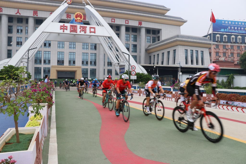 中越“两国一赛道”国际自行车赛。运动员在比赛中横穿中越友谊大桥。