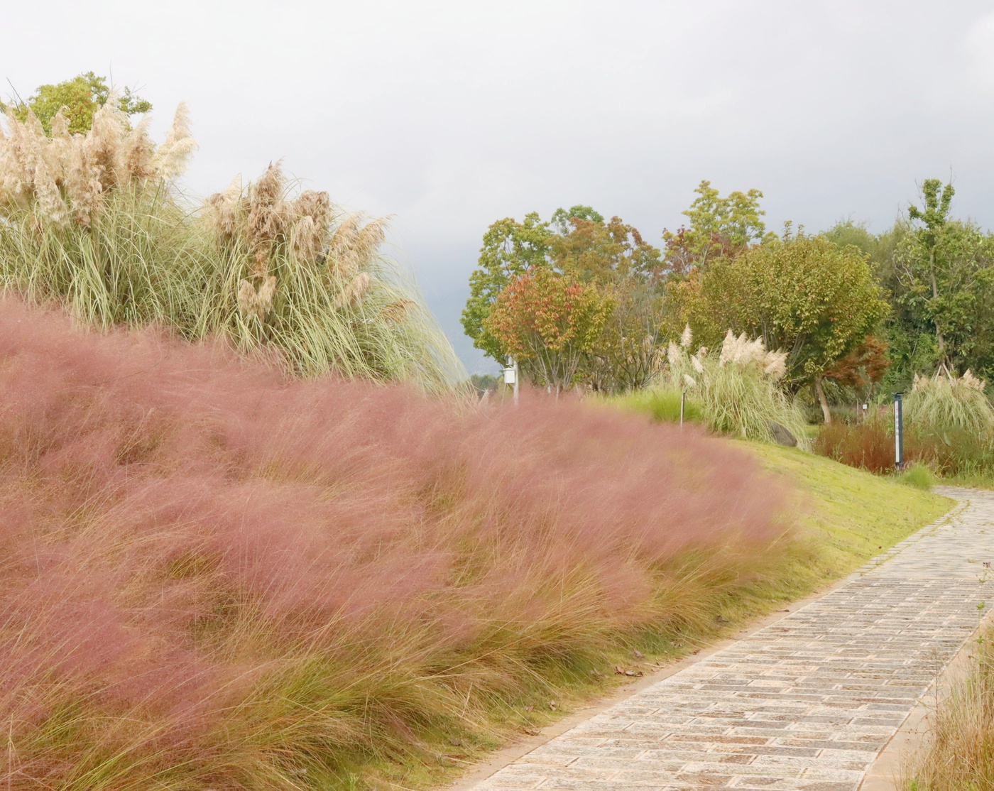 粉黛乱子草花期在每年9—11月 ,眼下正是观赏的最佳时机。它们身姿轻盈,纤细的茎秆支撑着云雾般的粉色花穗,一大片连在一起,像是给大地铺上了一层轻柔的粉色绒毯。微风吹过时,花穗轻轻摇曳,如梦似幻,让人不禁沉醉在这粉色的浪漫之中。