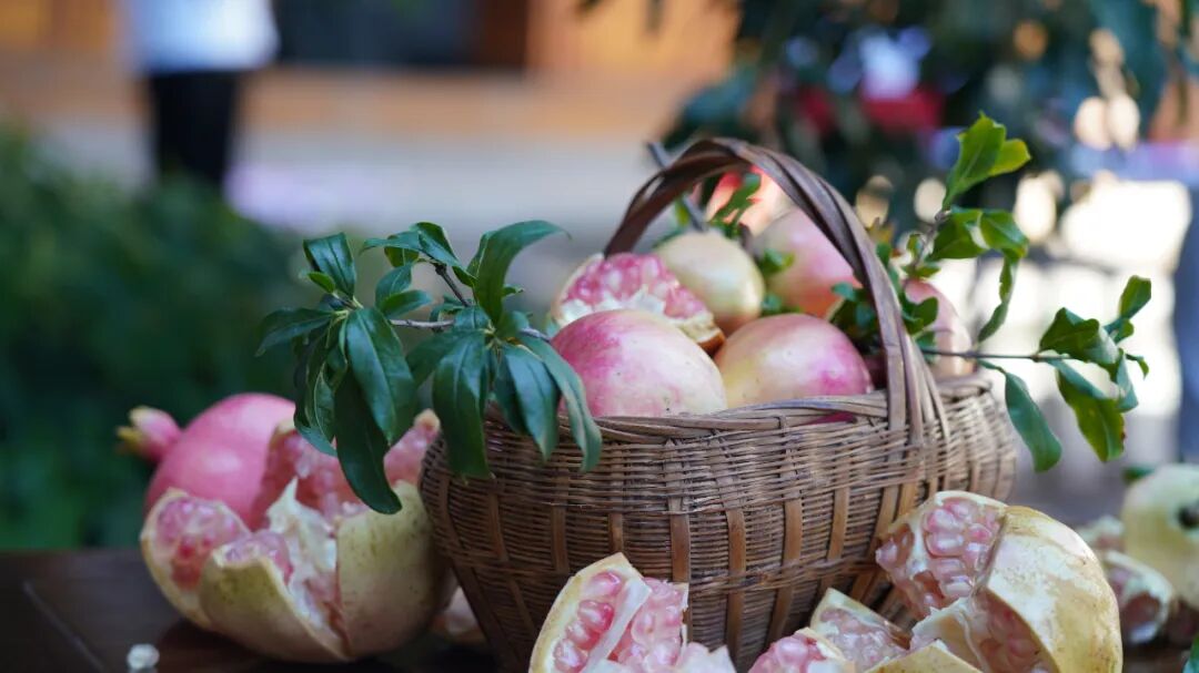 当地人最懂石榴的百变滋味——鲜榨石榴汁在玻璃杯中泛着红宝石般的光泽;石榴酒酸甜爽口,保留了石榴的天然风味;石榴鲜花饼、石榴蛋糕等烘焙产品带旅居客感受着果香芬芳。