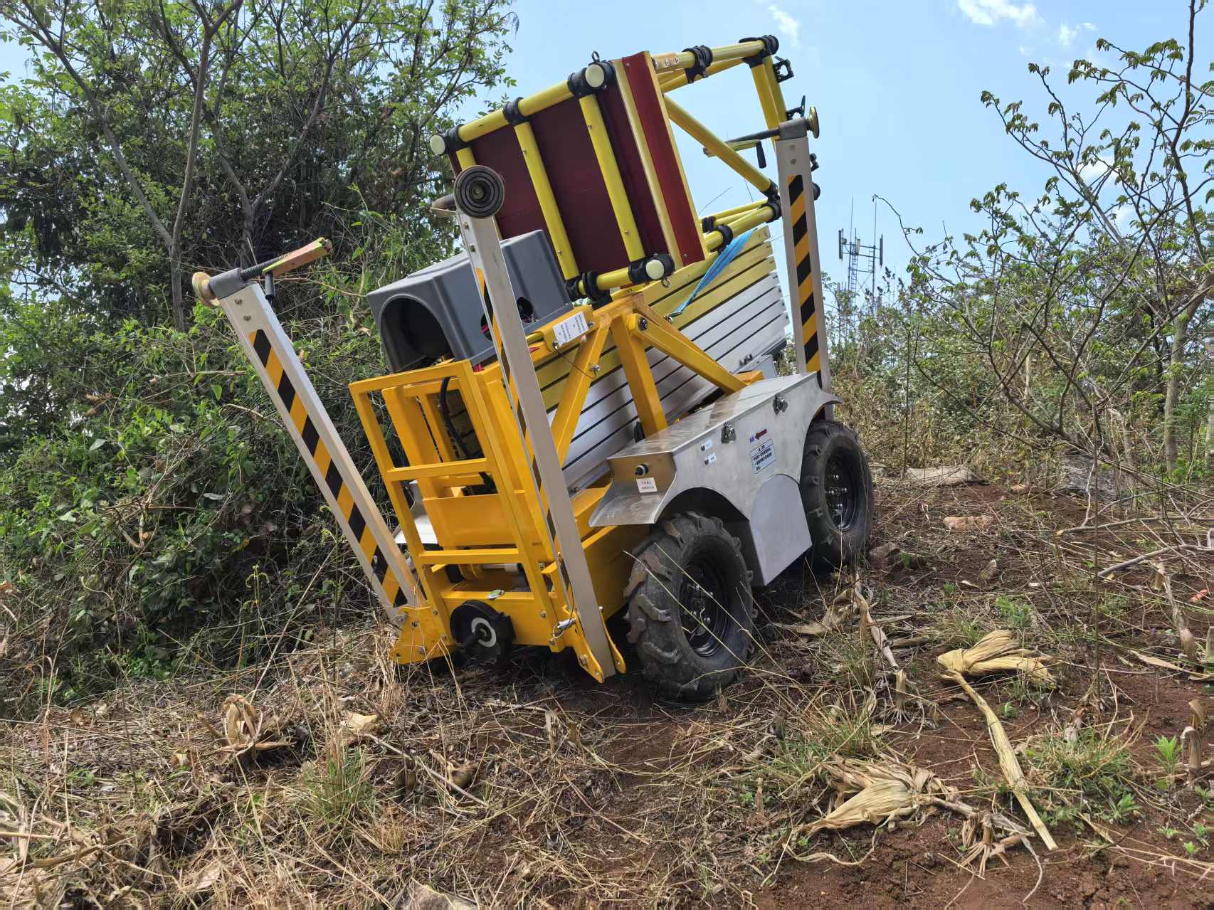 本成果是针对配网带电作业及停电检修工作而研发的一种单桅杆垂直升降平台,上部为绝缘材料制作,下部为金属桅杆及绝缘主臂组成,绝缘平台和主臂可拆卸,方便维护保养、搬运和存放。能满足10kV及以下带电作业承载工具规范的要求,整体重量600公斤,绝缘平台额定载荷150公斤,蓄电池容量可实现野外不间断持续使用≥4小时,最大作业高度10米,有遥控在上坡、山地行走、爬楼梯等辅助功能。可以开展10kV及以下配电线路部分不停电作业或停电检修时装、拆接地线等工作。