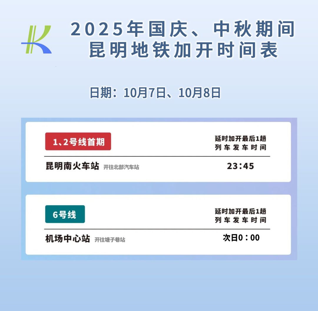 为方便晚间抵昆旅客的顺利出行,做好高铁站、机场的地铁运输接驳工作,昆明地铁将在10月7日、8日延长运营服务时间。